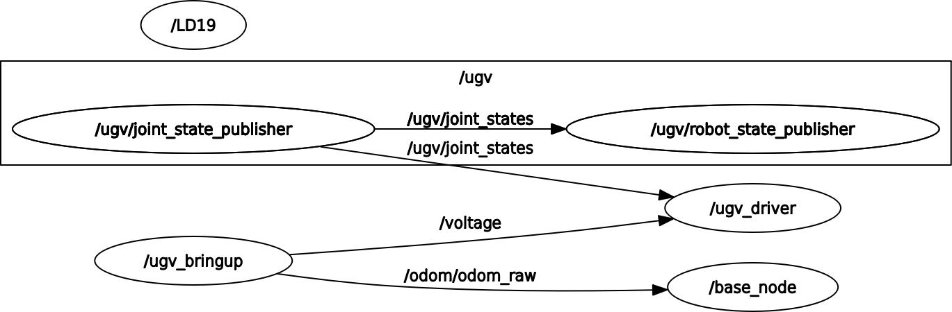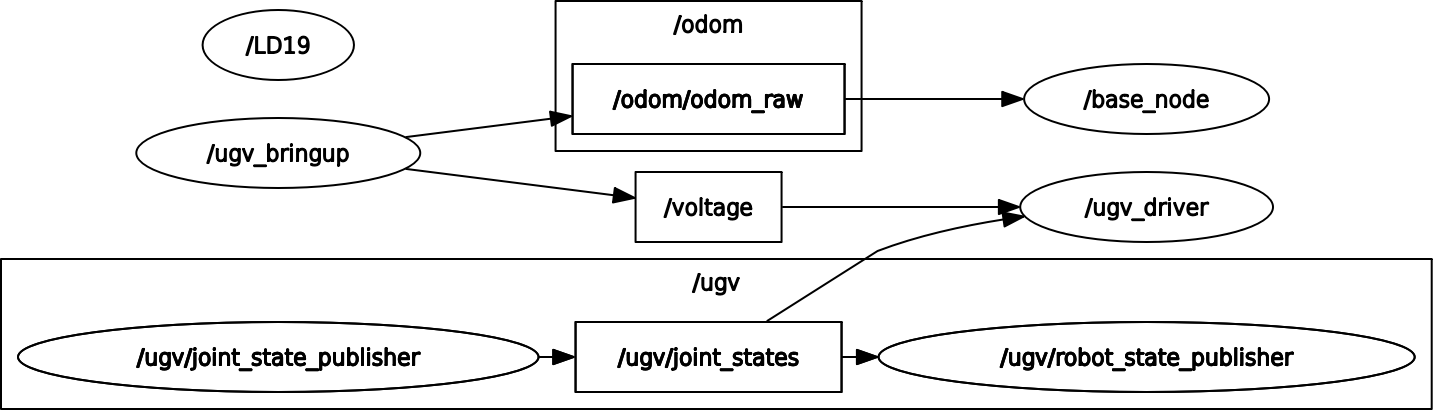 Checked ugv_bringup documentation, and try to make a rosgraph. Checking at WSL, I only got part of the nodes that are visible with ros2 node list. ros2 run rqt_graph rqt_graph gave: