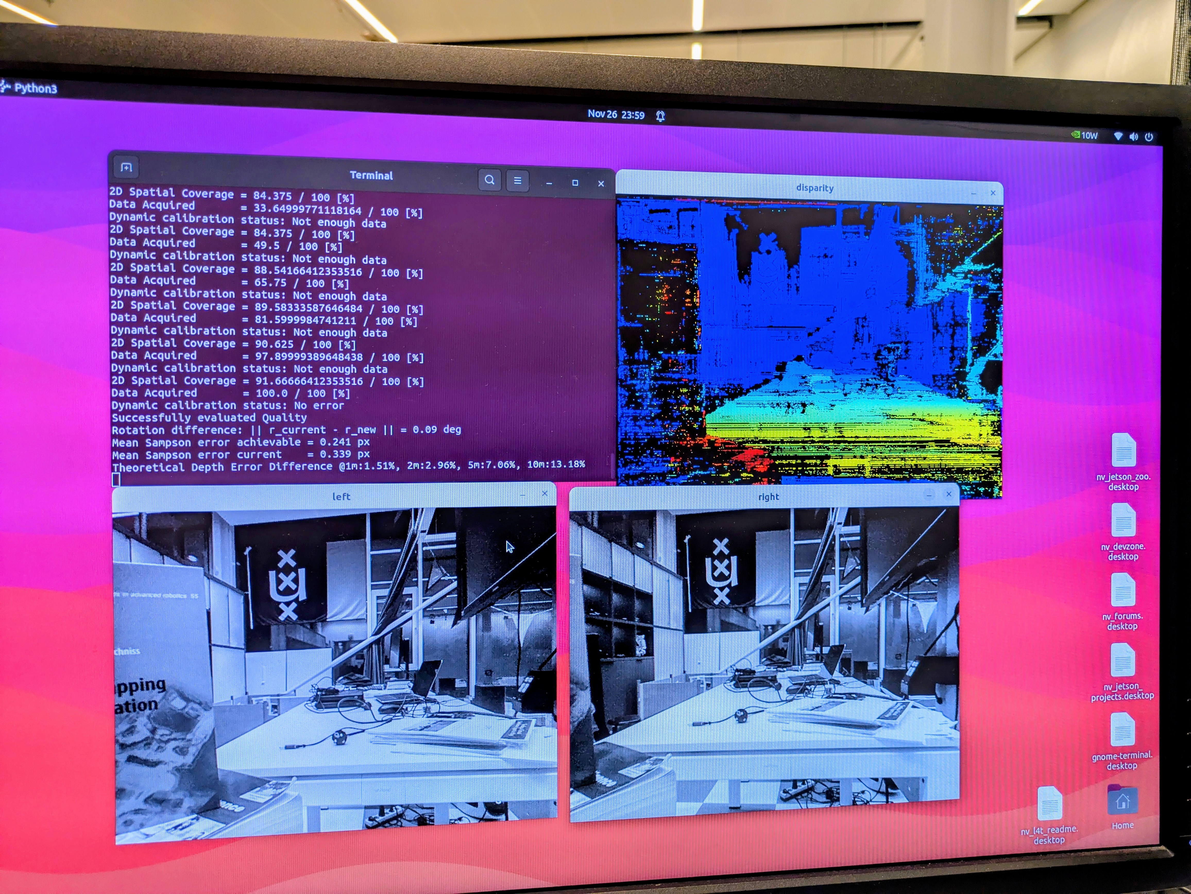 The succesfull calibration report directly following indicated a rotation difference of 0.01 deg, a achievable Sampson error of 0.123px, a current Sampson error of 0.122px, a theoretical depth error rangeing from 0.19% @1m to 1.83% @10m.