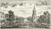 Gesigt van de Jan Roode Poorts Tooren, te sien, naar de Luytersche nieuwe Kerk tot Amsterdam.  Leonard Schenk (circa 1720), after Abraham Rademaker.  |