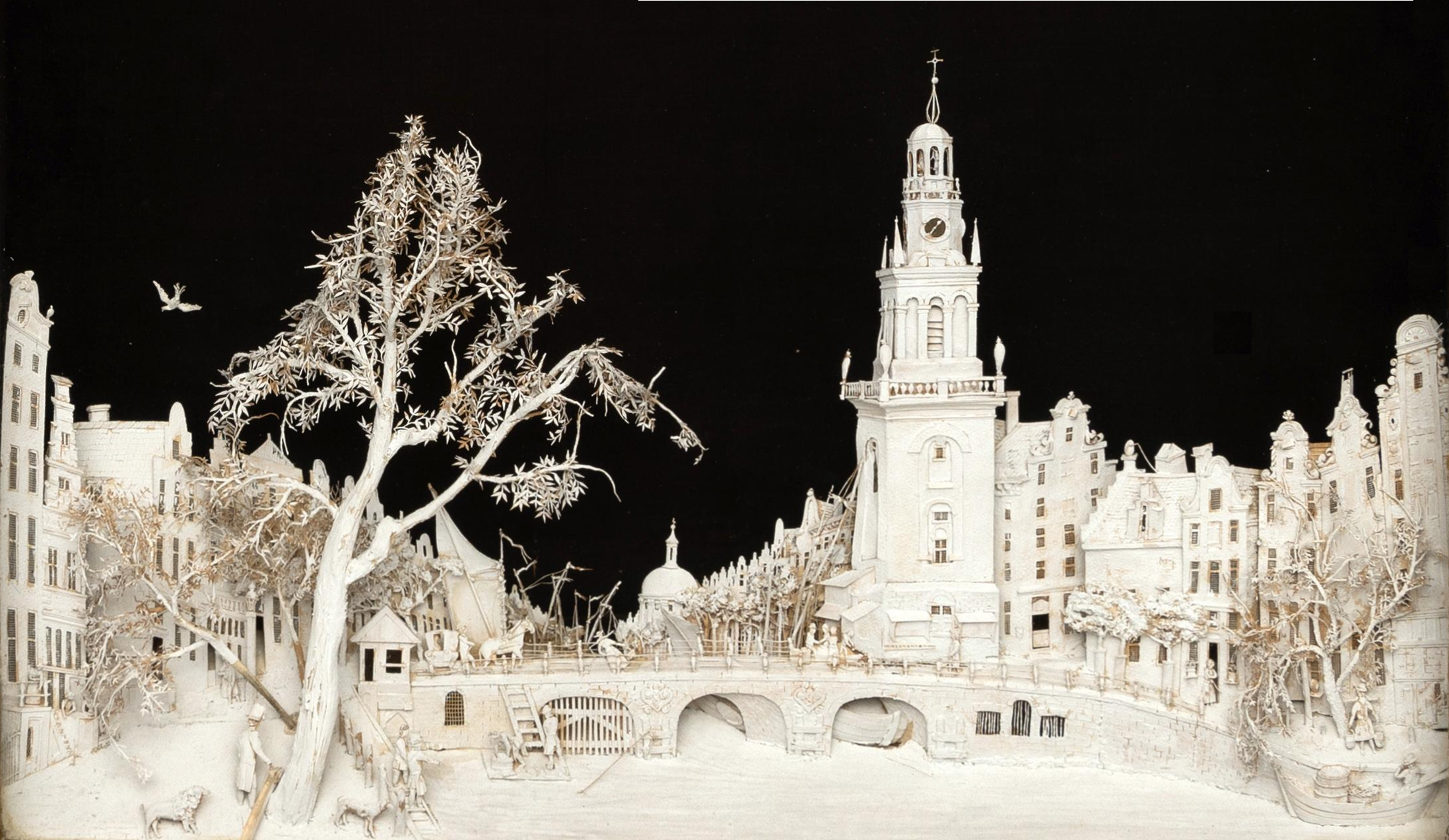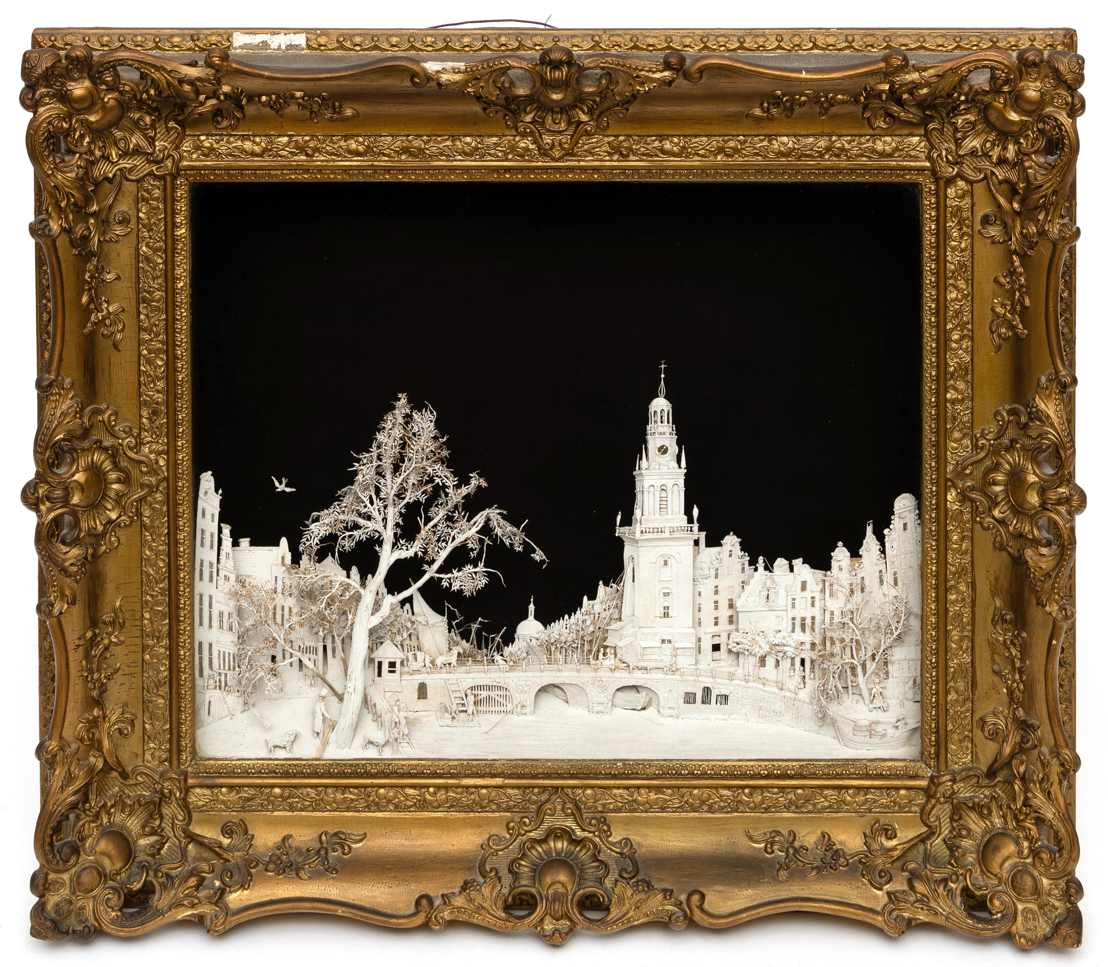Spotted at October 2025 auction in De Zwaan: a 'bavelaar', a 2.5-D tableau:  Jan Roodepoortstoren, (imagine our house between it and the round church dome), by Hendrik Berck (1828), made of paper and wood, estimated value €3000-€5000. The tower was demolished in 18, base now marked in pavement.  |
