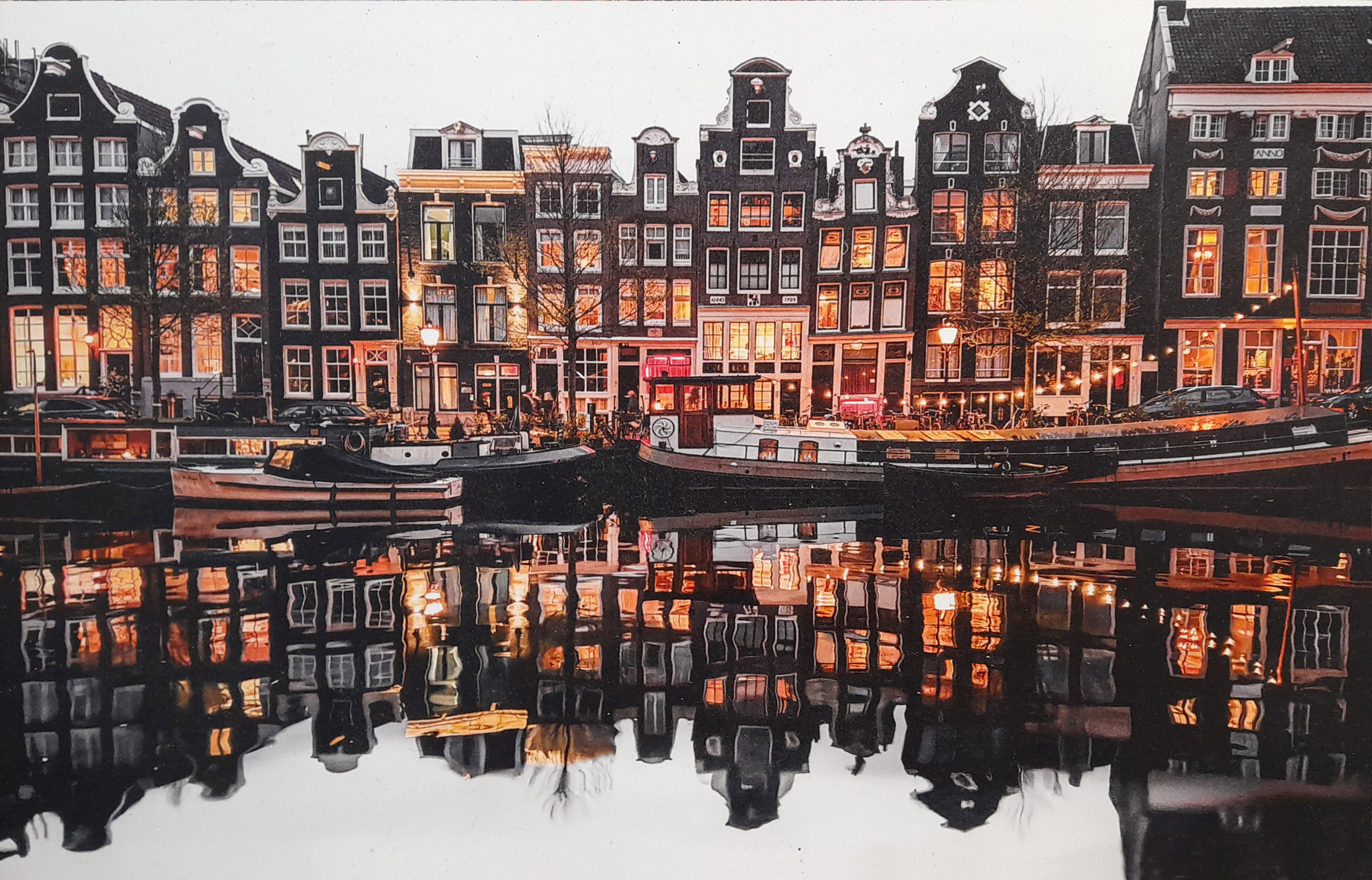 Arden Art Gallery sells printed pictures of our block on various media (2025). They call this scene "Magic Reflections", it was taken in 2020, during the Covid quarantaine time. There is also a more recent view, with the modern boat. Here a picture of their store, Prinsengracht 529. Another location is at Nieuwe Spiegelstraat 43H. |
